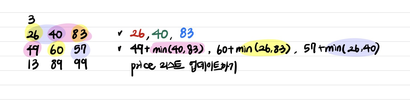 모든 집을 칠하는 비용의 최솟값 = 가장 마지막 행의 값 중 가장 작은 값 = min(price[n-1])